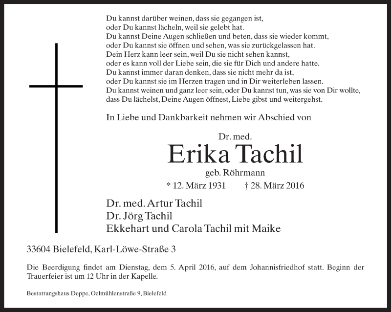 Hier finden Sie alle Traueranzeigen aus der Zeitung, die bisher für Erika Tachil erschienen sind. Weitere Traueranzeigen, die in der Zeitung erscheinen, werden hier ebenfalls aufgelistet