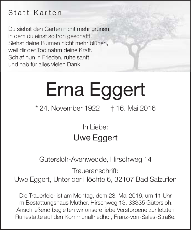 Hier finden Sie alle Traueranzeigen aus der Zeitung, die bisher für Erna Eggert erschienen sind. Weitere Traueranzeigen, die in der Zeitung erscheinen, werden hier ebenfalls aufgelistet