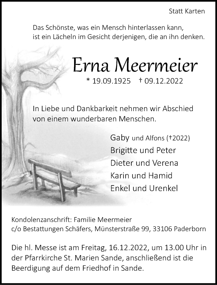Hier finden Sie alle Traueranzeigen aus der Zeitung, die bisher für Erna Meermeier erschienen sind. Weitere Traueranzeigen, die in der Zeitung erscheinen, werden hier ebenfalls aufgelistet