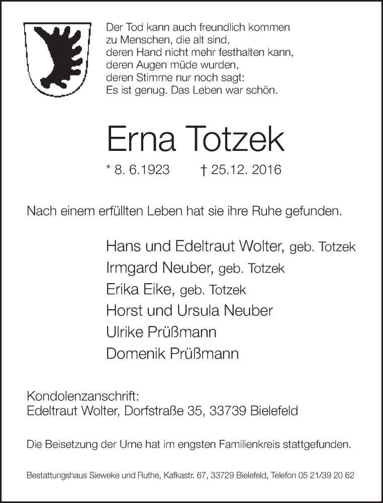 Hier finden Sie alle Traueranzeigen aus der Zeitung, die bisher für Erna Totzek erschienen sind. Weitere Traueranzeigen, die in der Zeitung erscheinen, werden hier ebenfalls aufgelistet