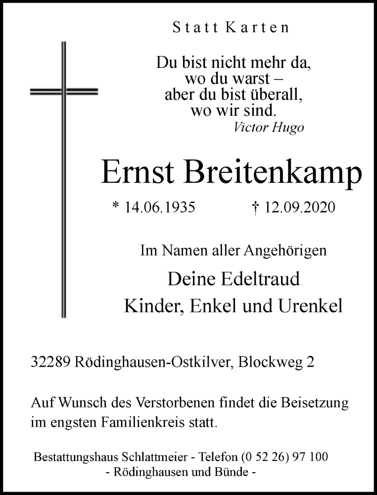 Hier finden Sie alle Traueranzeigen aus der Zeitung, die bisher für Ernst Breitenkamp erschienen sind. Weitere Traueranzeigen, die in der Zeitung erscheinen, werden hier ebenfalls aufgelistet