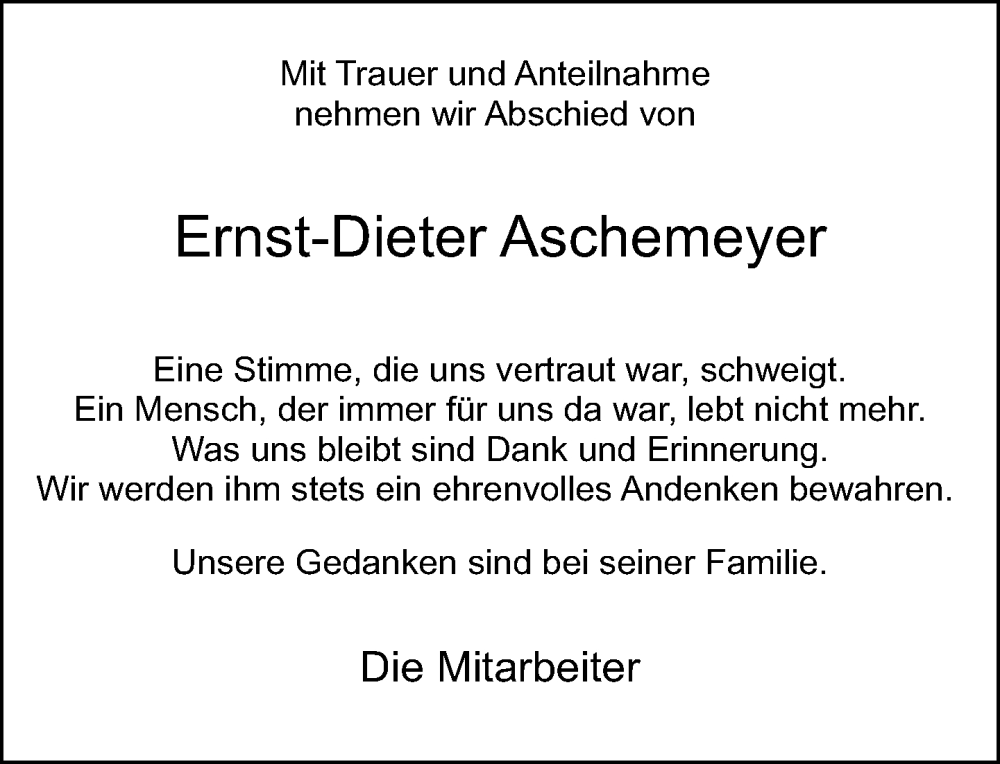 Hier finden Sie alle Traueranzeigen aus der Zeitung, die bisher für Ernst-Dieter Aschemeyer erschienen sind. Weitere Traueranzeigen, die in der Zeitung erscheinen, werden hier ebenfalls aufgelistet