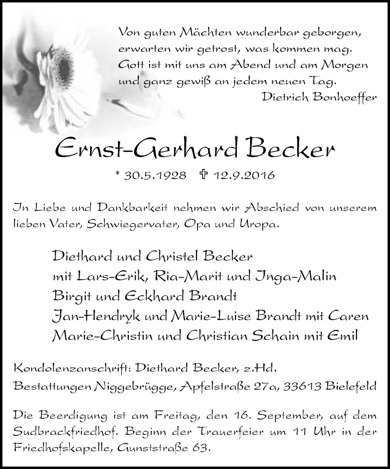 Hier finden Sie alle Traueranzeigen aus der Zeitung, die bisher für Ernst-Gerhard Becker erschienen sind. Weitere Traueranzeigen, die in der Zeitung erscheinen, werden hier ebenfalls aufgelistet