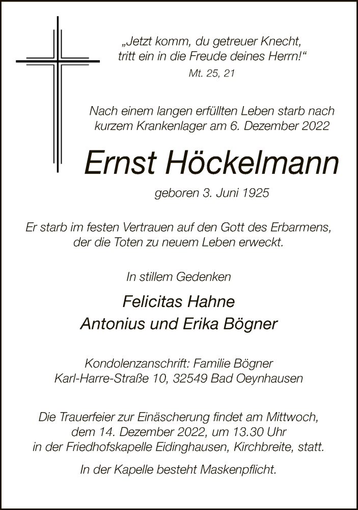 Hier finden Sie alle Traueranzeigen aus der Zeitung, die bisher für Ernst Höckelmann erschienen sind. Weitere Traueranzeigen, die in der Zeitung erscheinen, werden hier ebenfalls aufgelistet