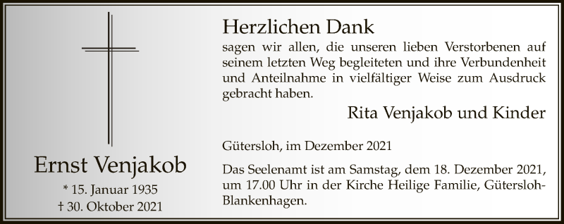 Hier finden Sie alle Traueranzeigen aus der Zeitung, die bisher für Ernst Venjakob erschienen sind. Weitere Traueranzeigen, die in der Zeitung erscheinen, werden hier ebenfalls aufgelistet