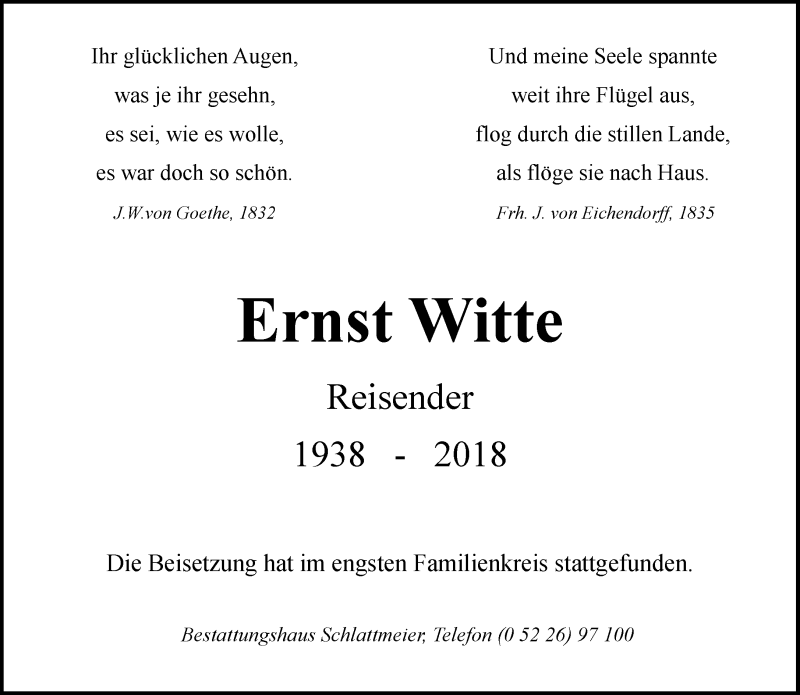 Hier finden Sie alle Traueranzeigen aus der Zeitung, die bisher für Ernst Witte erschienen sind. Weitere Traueranzeigen, die in der Zeitung erscheinen, werden hier ebenfalls aufgelistet