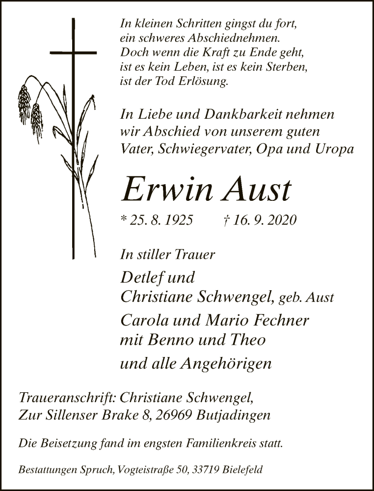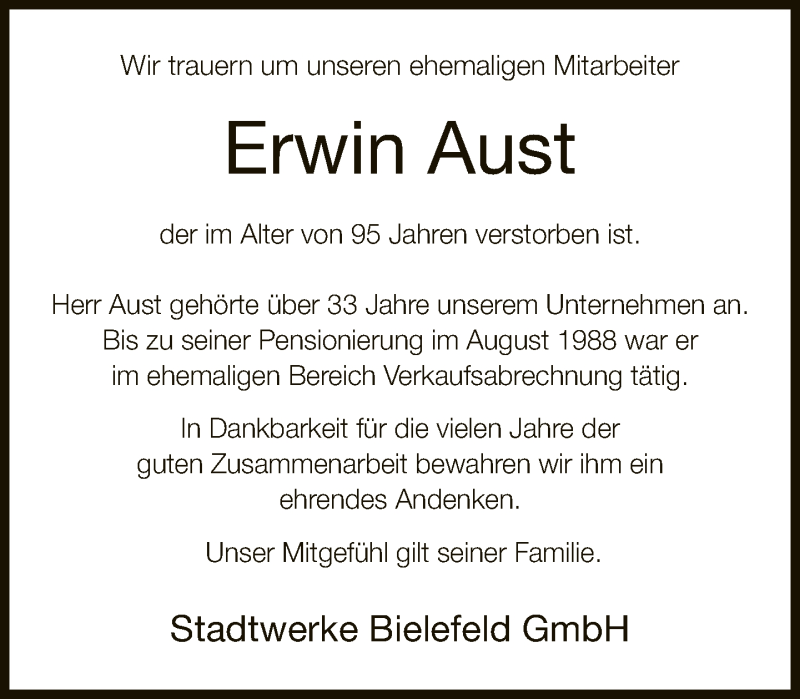 Hier finden Sie alle Traueranzeigen aus der Zeitung, die bisher für Erwin Aust erschienen sind. Weitere Traueranzeigen, die in der Zeitung erscheinen, werden hier ebenfalls aufgelistet