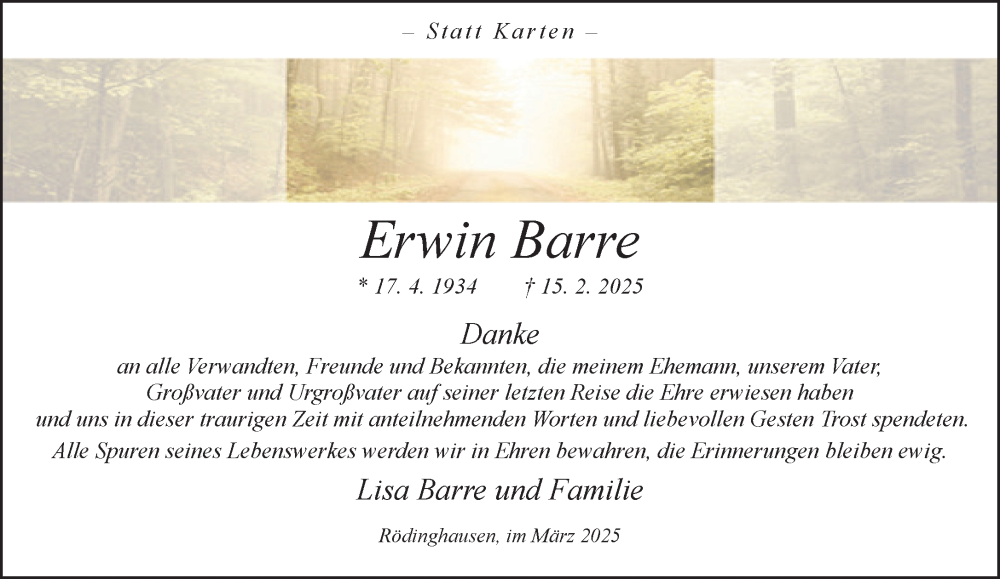 Hier finden Sie alle Traueranzeigen aus der Zeitung, die bisher für Erwin Barre erschienen sind. Weitere Traueranzeigen, die in der Zeitung erscheinen, werden hier ebenfalls aufgelistet
