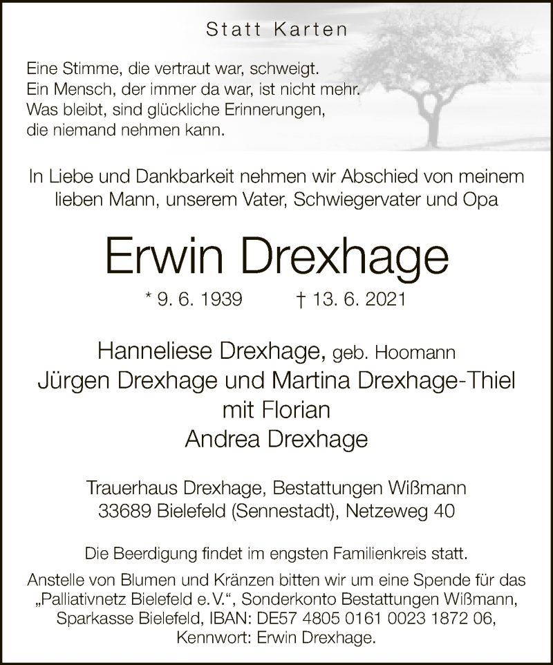 Hier finden Sie alle Traueranzeigen aus der Zeitung, die bisher für Erwin Drexhage erschienen sind. Weitere Traueranzeigen, die in der Zeitung erscheinen, werden hier ebenfalls aufgelistet