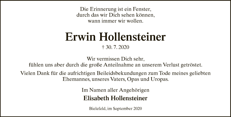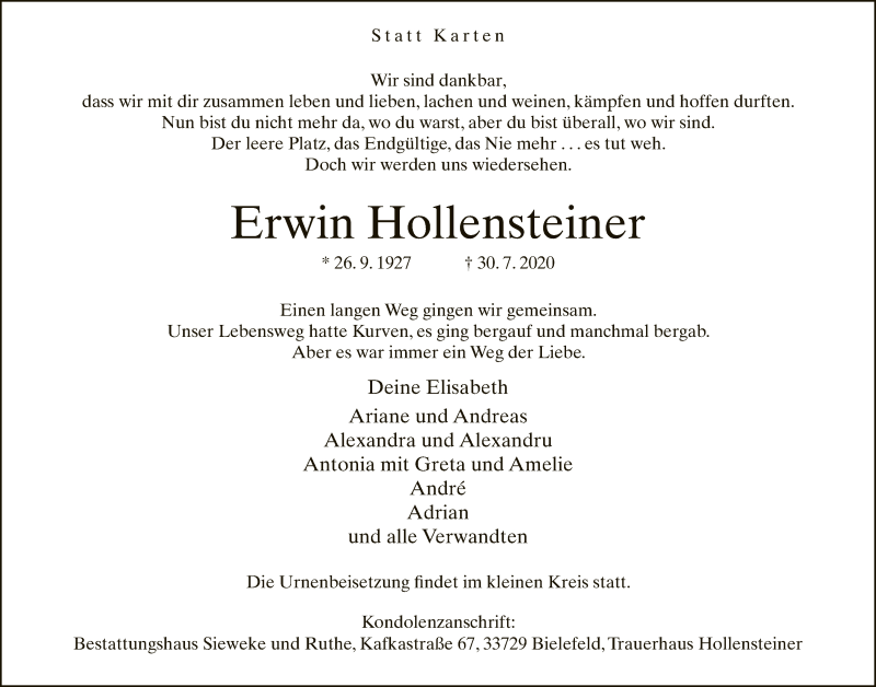 Hier finden Sie alle Traueranzeigen aus der Zeitung, die bisher für Erwin Hollensteiner erschienen sind. Weitere Traueranzeigen, die in der Zeitung erscheinen, werden hier ebenfalls aufgelistet