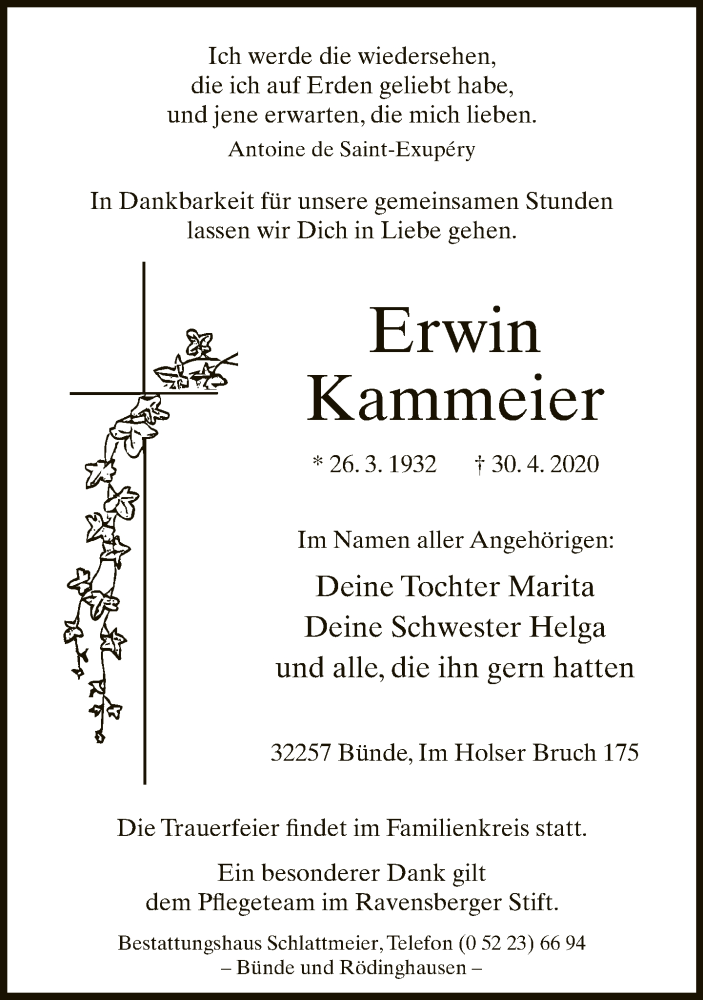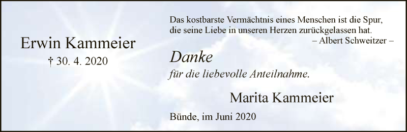 Hier finden Sie alle Traueranzeigen aus der Zeitung, die bisher für Erwin Kammeier erschienen sind. Weitere Traueranzeigen, die in der Zeitung erscheinen, werden hier ebenfalls aufgelistet