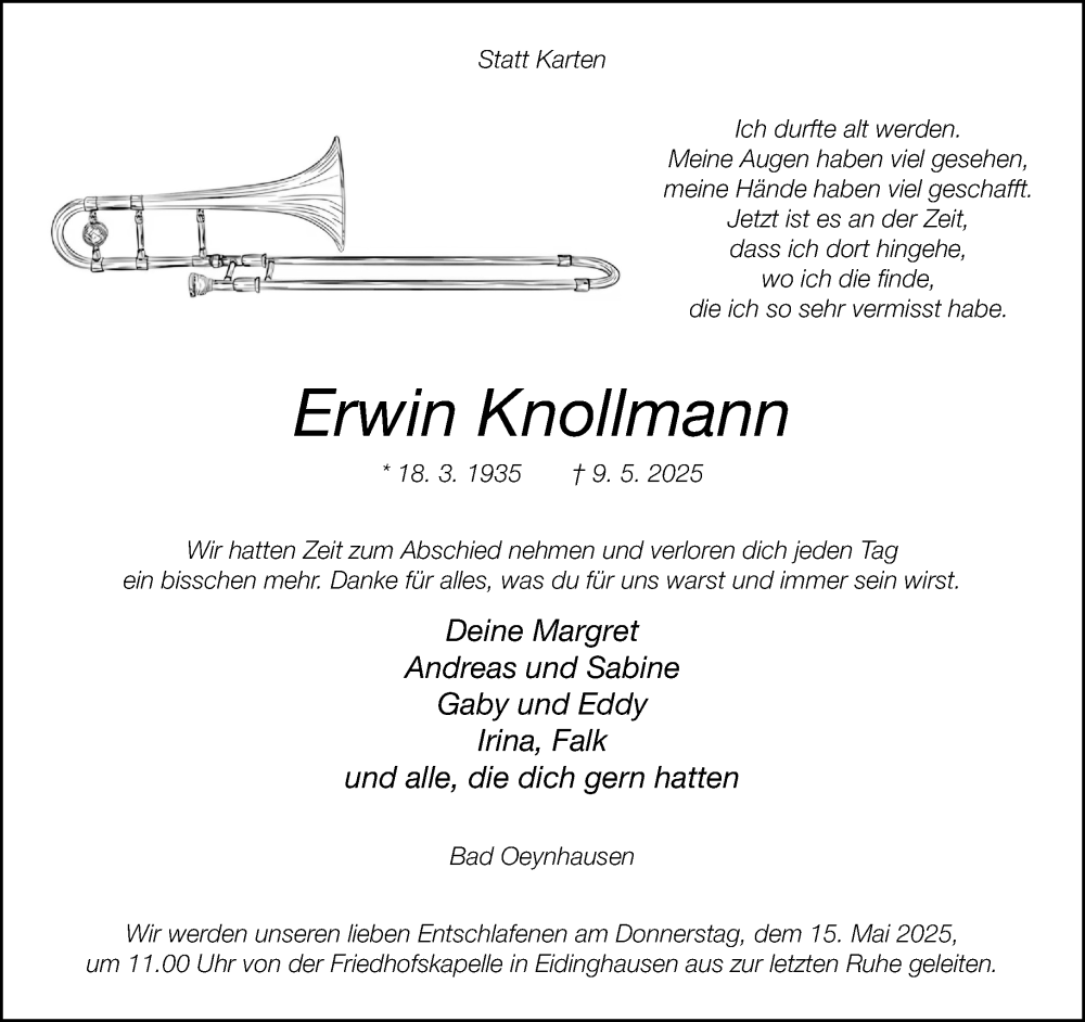 Hier finden Sie alle Traueranzeigen aus der Zeitung, die bisher für Erwin Knollmann erschienen sind. Weitere Traueranzeigen, die in der Zeitung erscheinen, werden hier ebenfalls aufgelistet