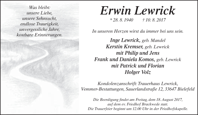 Hier finden Sie alle Traueranzeigen aus der Zeitung, die bisher für Erwin Lewrick erschienen sind. Weitere Traueranzeigen, die in der Zeitung erscheinen, werden hier ebenfalls aufgelistet