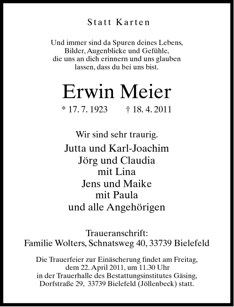 Hier finden Sie alle Traueranzeigen aus der Zeitung, die bisher für Erwin Meier erschienen sind. Weitere Traueranzeigen, die in der Zeitung erscheinen, werden hier ebenfalls aufgelistet