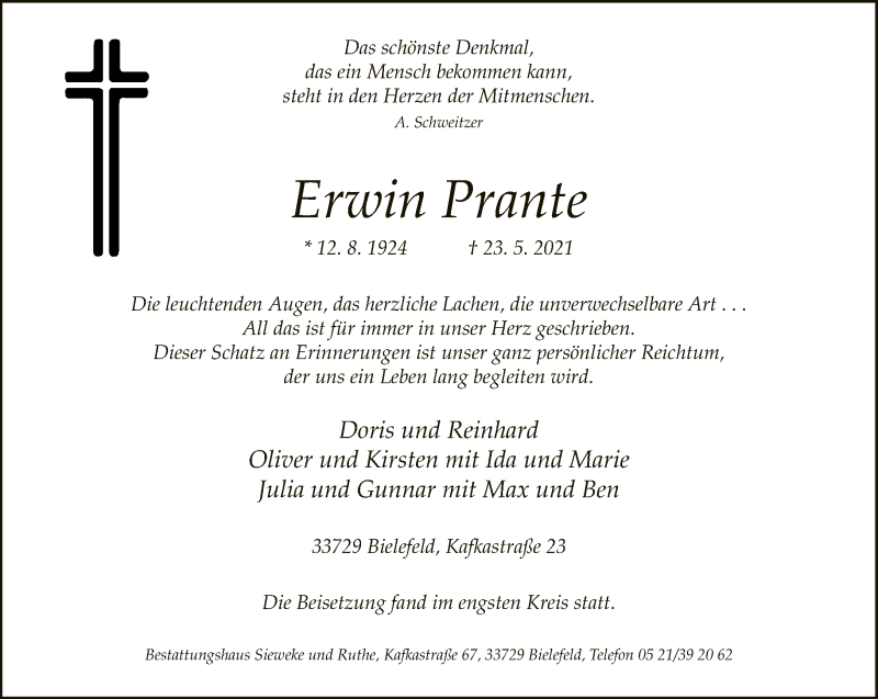 Hier finden Sie alle Traueranzeigen aus der Zeitung, die bisher für Erwin Prante erschienen sind. Weitere Traueranzeigen, die in der Zeitung erscheinen, werden hier ebenfalls aufgelistet