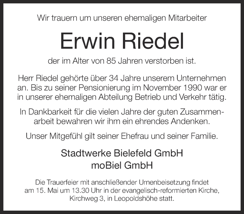 Hier finden Sie alle Traueranzeigen aus der Zeitung, die bisher für Erwin Riedel erschienen sind. Weitere Traueranzeigen, die in der Zeitung erscheinen, werden hier ebenfalls aufgelistet