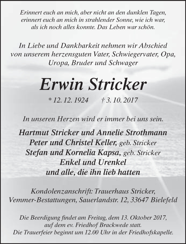 Hier finden Sie alle Traueranzeigen aus der Zeitung, die bisher für Erwin Stricker erschienen sind. Weitere Traueranzeigen, die in der Zeitung erscheinen, werden hier ebenfalls aufgelistet