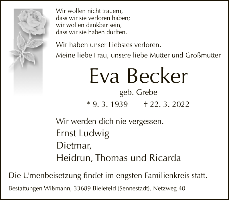 Hier finden Sie alle Traueranzeigen aus der Zeitung, die bisher für Eva Becker erschienen sind. Weitere Traueranzeigen, die in der Zeitung erscheinen, werden hier ebenfalls aufgelistet