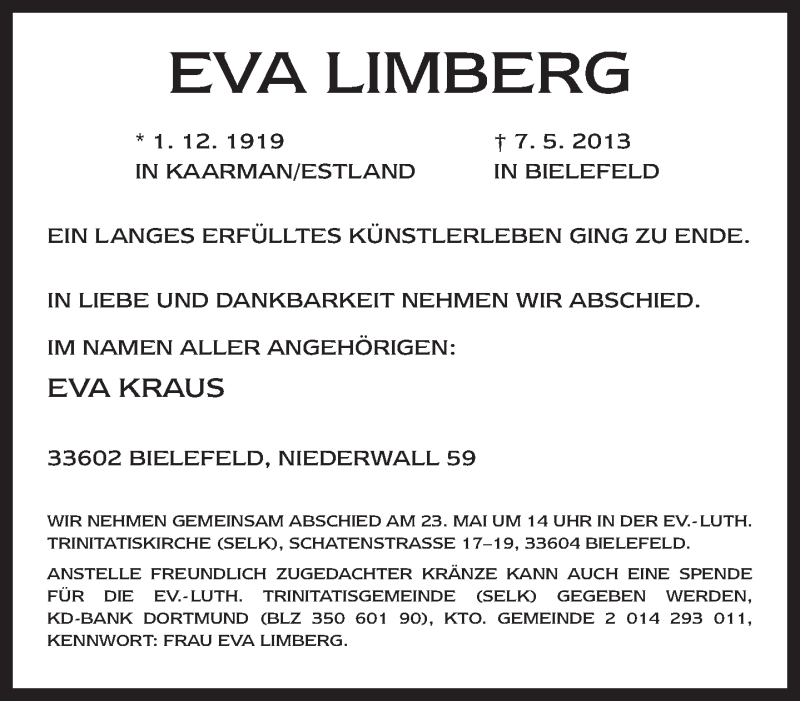 Hier finden Sie alle Traueranzeigen aus der Zeitung, die bisher für Eva Limberg erschienen sind. Weitere Traueranzeigen, die in der Zeitung erscheinen, werden hier ebenfalls aufgelistet