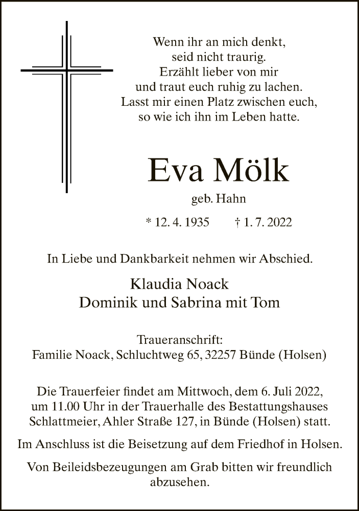 Hier finden Sie alle Traueranzeigen aus der Zeitung, die bisher für Eva Mölk erschienen sind. Weitere Traueranzeigen, die in der Zeitung erscheinen, werden hier ebenfalls aufgelistet