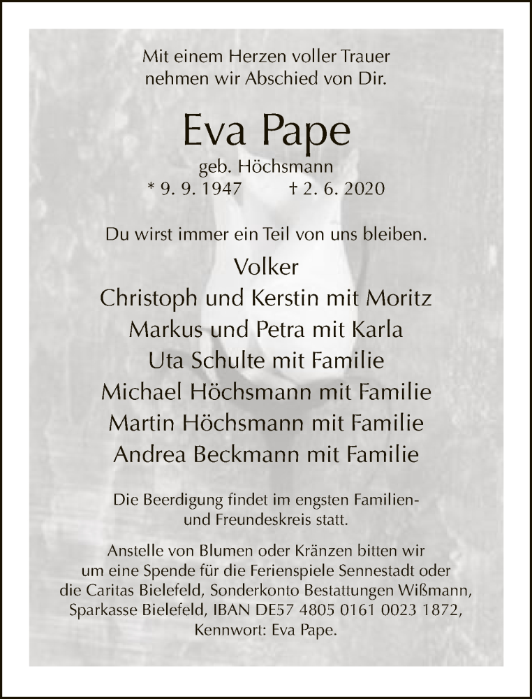 Hier finden Sie alle Traueranzeigen aus der Zeitung, die bisher für Eva Pape erschienen sind. Weitere Traueranzeigen, die in der Zeitung erscheinen, werden hier ebenfalls aufgelistet