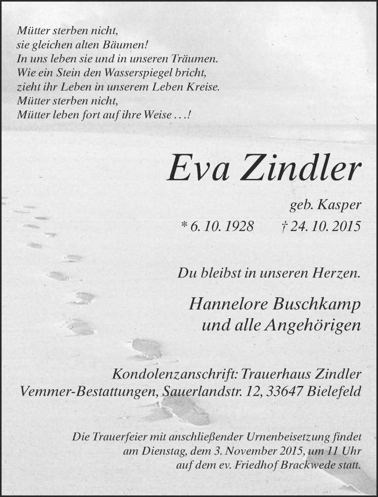 Hier finden Sie alle Traueranzeigen aus der Zeitung, die bisher für Eva Zindler erschienen sind. Weitere Traueranzeigen, die in der Zeitung erscheinen, werden hier ebenfalls aufgelistet