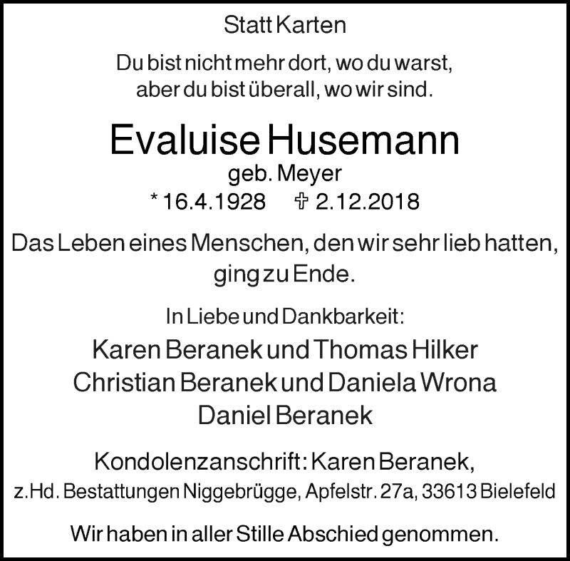 Hier finden Sie alle Traueranzeigen aus der Zeitung, die bisher für Evaluise Husemann erschienen sind. Weitere Traueranzeigen, die in der Zeitung erscheinen, werden hier ebenfalls aufgelistet