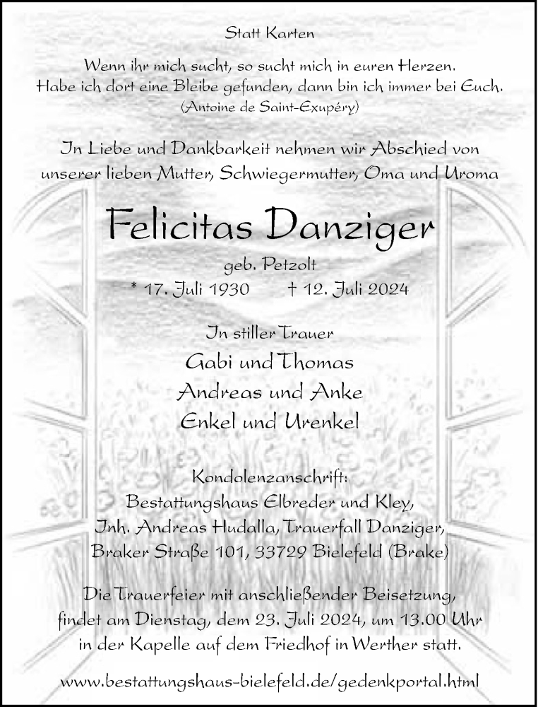 Hier finden Sie alle Traueranzeigen aus der Zeitung, die bisher für Felicitas Danziger erschienen sind. Weitere Traueranzeigen, die in der Zeitung erscheinen, werden hier ebenfalls aufgelistet