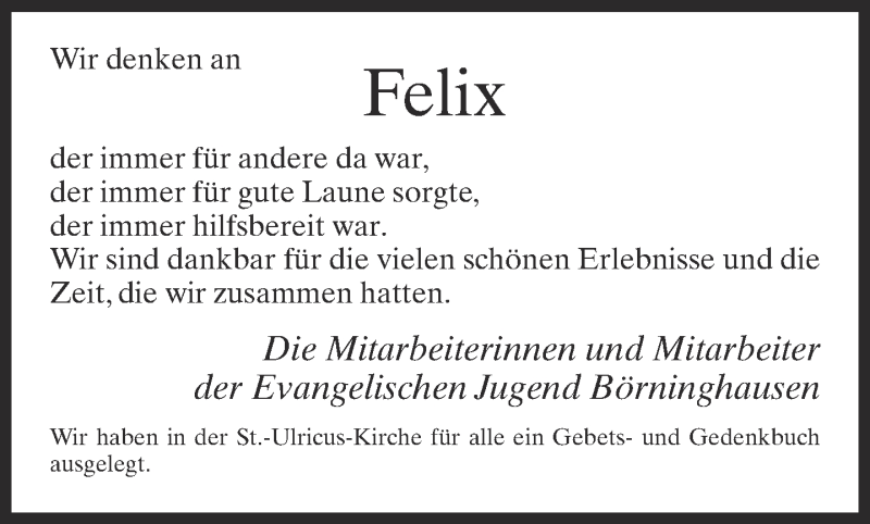 Hier finden Sie alle Traueranzeigen aus der Zeitung, die bisher für Felix erschienen sind. Weitere Traueranzeigen, die in der Zeitung erscheinen, werden hier ebenfalls aufgelistet