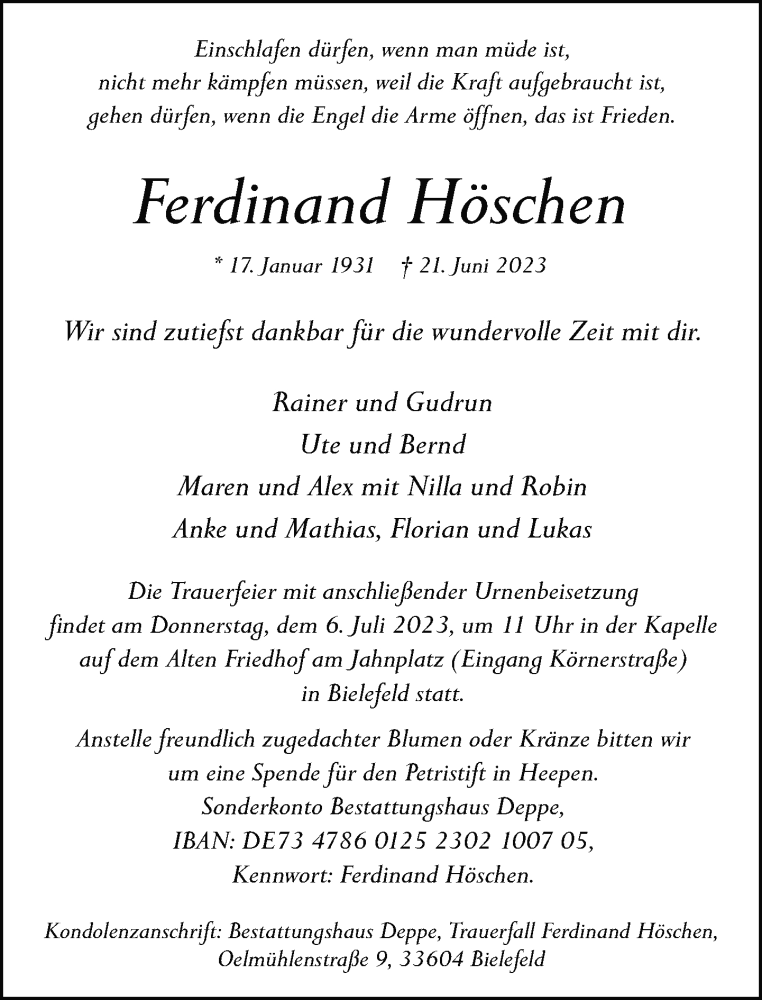 Hier finden Sie alle Traueranzeigen aus der Zeitung, die bisher für Ferdinand Höschen erschienen sind. Weitere Traueranzeigen, die in der Zeitung erscheinen, werden hier ebenfalls aufgelistet