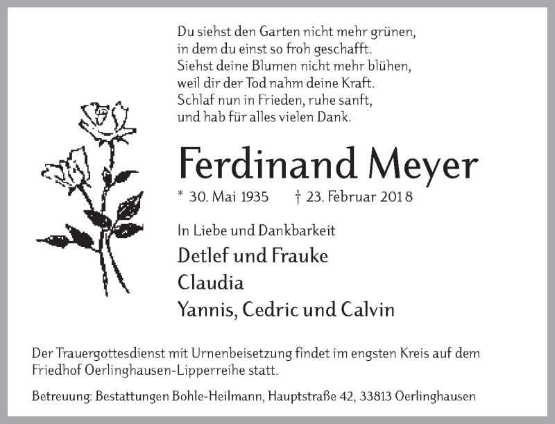 Hier finden Sie alle Traueranzeigen aus der Zeitung, die bisher für Ferdinand Meyer erschienen sind. Weitere Traueranzeigen, die in der Zeitung erscheinen, werden hier ebenfalls aufgelistet