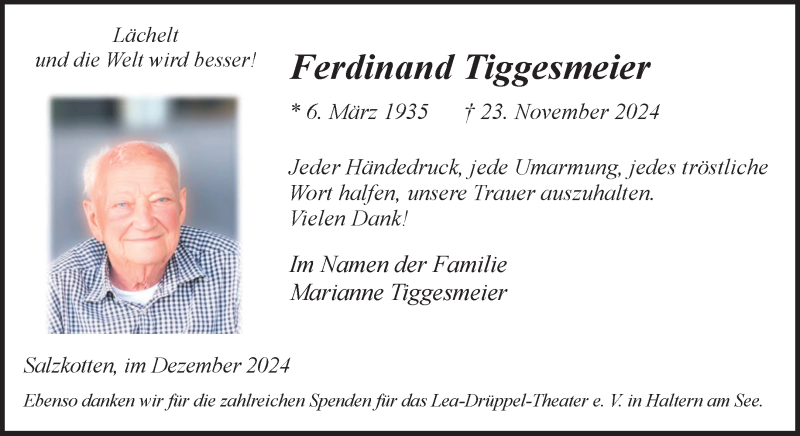 Hier finden Sie alle Traueranzeigen aus der Zeitung, die bisher für Ferdinand Tiggesmeier erschienen sind. Weitere Traueranzeigen, die in der Zeitung erscheinen, werden hier ebenfalls aufgelistet