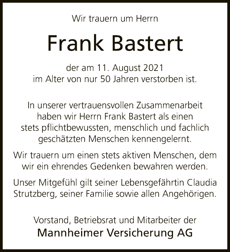 Hier finden Sie alle Traueranzeigen aus der Zeitung, die bisher für Frank Bastert erschienen sind. Weitere Traueranzeigen, die in der Zeitung erscheinen, werden hier ebenfalls aufgelistet