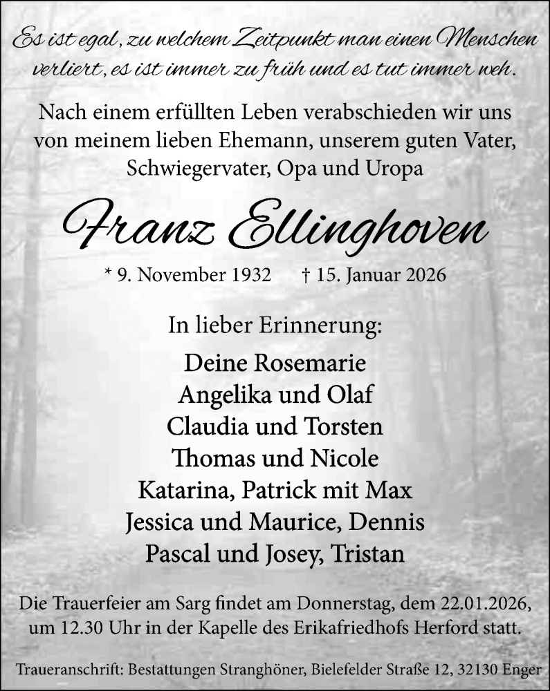 Hier finden Sie alle Traueranzeigen aus der Zeitung, die bisher für Franz Ellinghoven erschienen sind. Weitere Traueranzeigen, die in der Zeitung erscheinen, werden hier ebenfalls aufgelistet