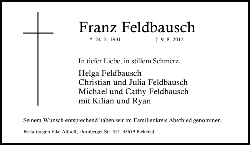 Hier finden Sie alle Traueranzeigen aus der Zeitung, die bisher für Franz Feldbausch erschienen sind. Weitere Traueranzeigen, die in der Zeitung erscheinen, werden hier ebenfalls aufgelistet