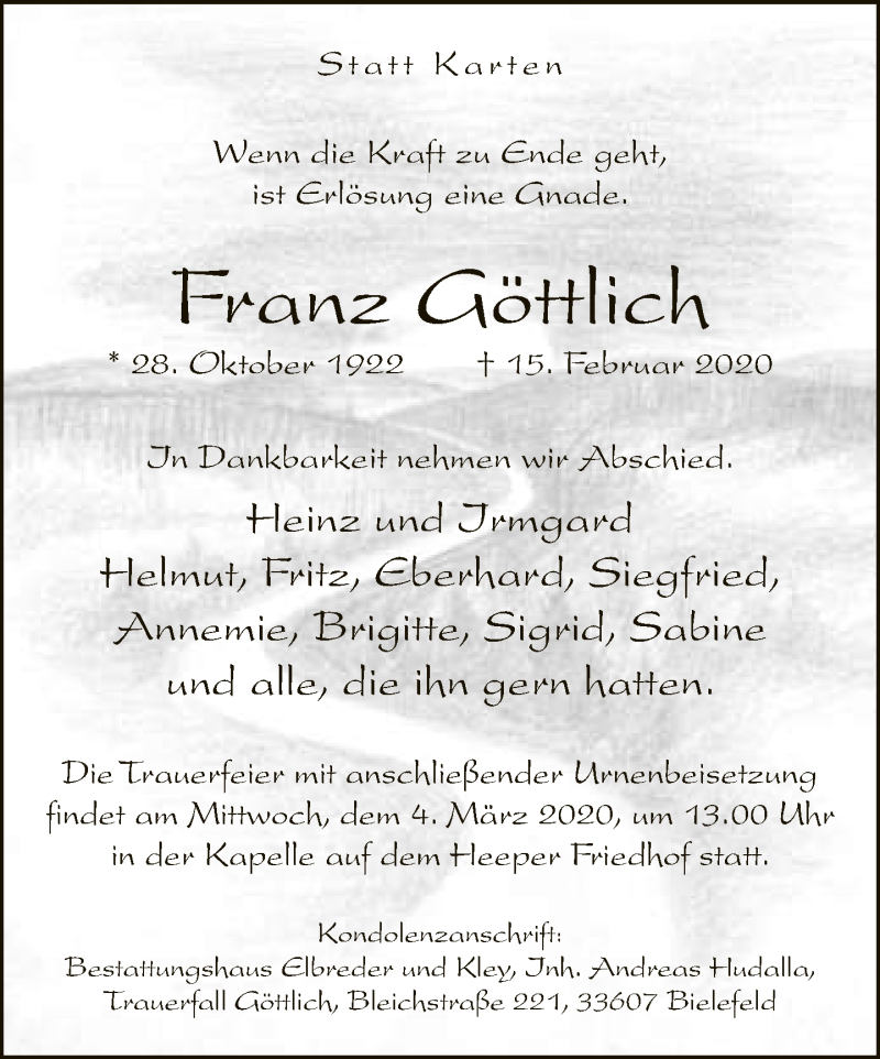 Hier finden Sie alle Traueranzeigen aus der Zeitung, die bisher für Franz Göttlich erschienen sind. Weitere Traueranzeigen, die in der Zeitung erscheinen, werden hier ebenfalls aufgelistet