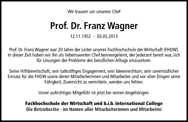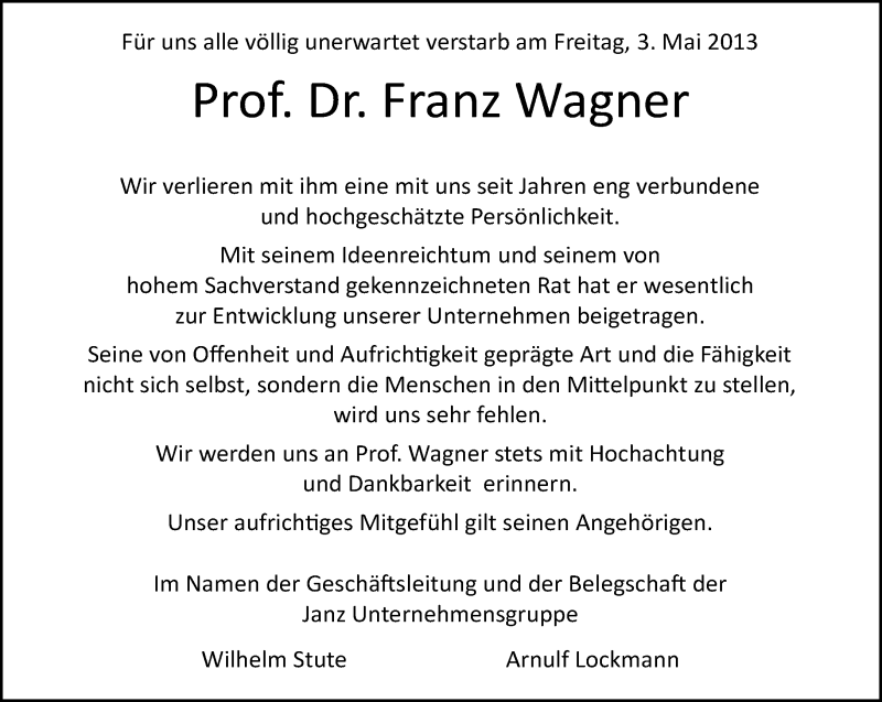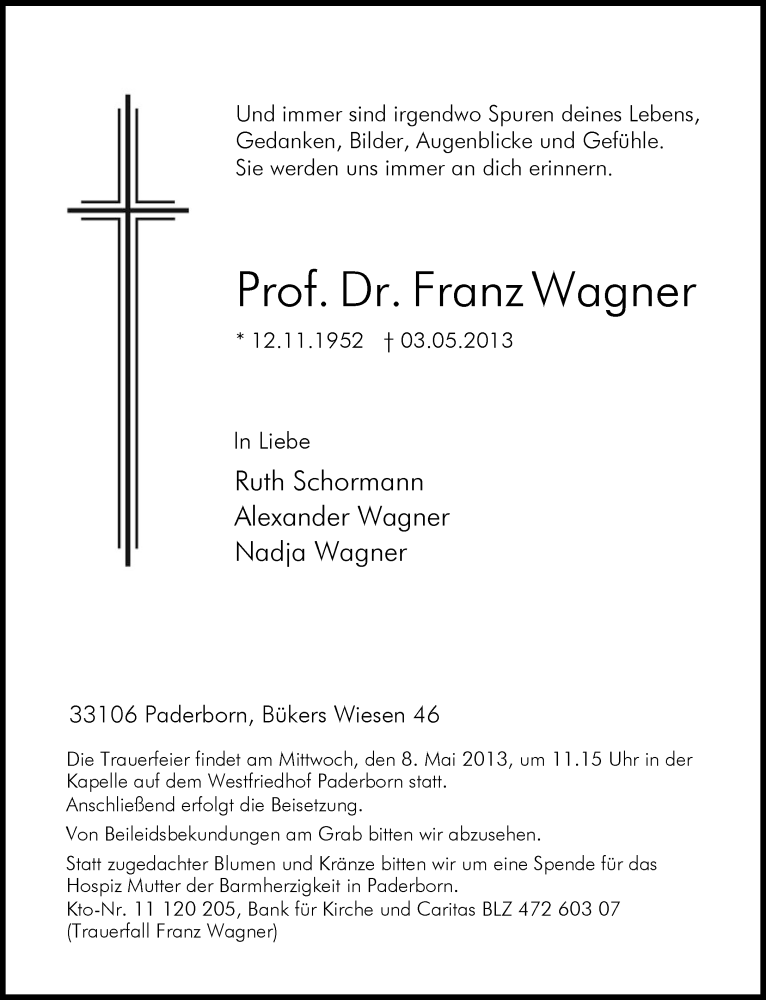 Hier finden Sie alle Traueranzeigen aus der Zeitung, die bisher für Franz Wagner erschienen sind. Weitere Traueranzeigen, die in der Zeitung erscheinen, werden hier ebenfalls aufgelistet