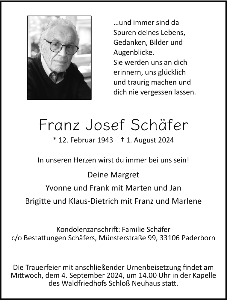 Hier finden Sie alle Traueranzeigen aus der Zeitung, die bisher für Franz Josef Schäfer erschienen sind. Weitere Traueranzeigen, die in der Zeitung erscheinen, werden hier ebenfalls aufgelistet