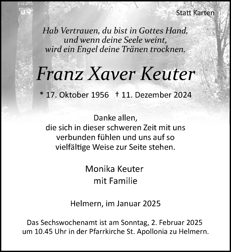 Hier finden Sie alle Traueranzeigen aus der Zeitung, die bisher für Franz Xaver Keuter erschienen sind. Weitere Traueranzeigen, die in der Zeitung erscheinen, werden hier ebenfalls aufgelistet