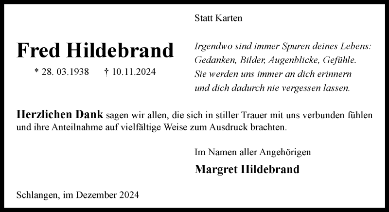 Hier finden Sie alle Traueranzeigen aus der Zeitung, die bisher für Fred Hildebrand erschienen sind. Weitere Traueranzeigen, die in der Zeitung erscheinen, werden hier ebenfalls aufgelistet