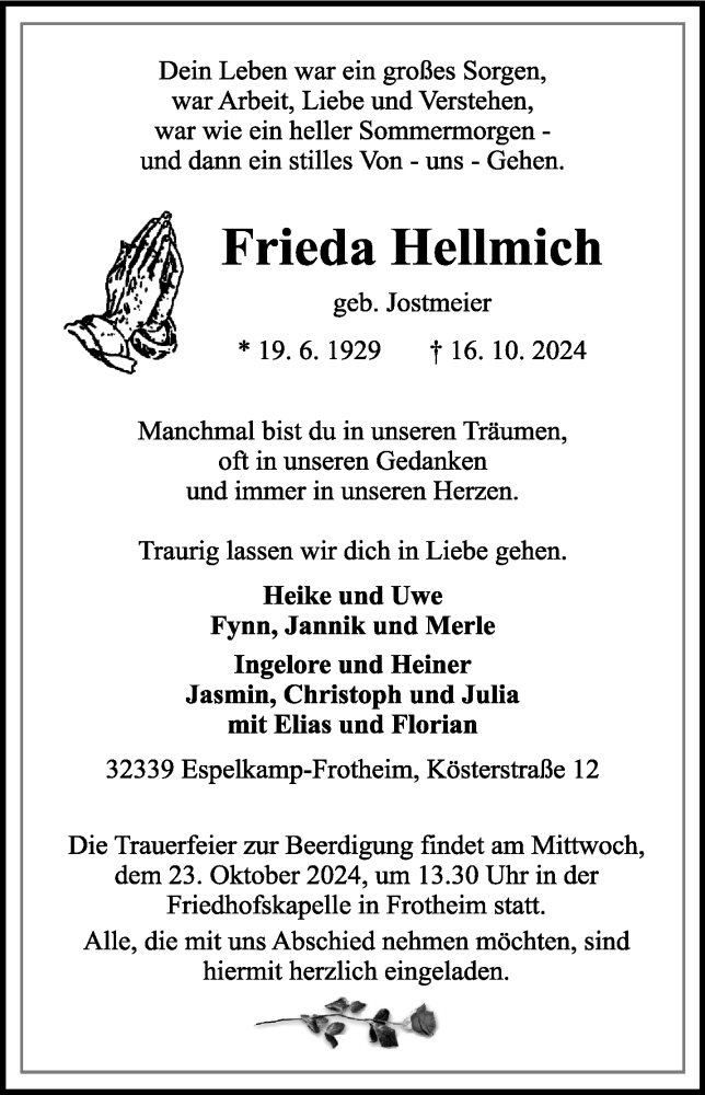 Hier finden Sie alle Traueranzeigen aus der Zeitung, die bisher für Frieda Hellmich erschienen sind. Weitere Traueranzeigen, die in der Zeitung erscheinen, werden hier ebenfalls aufgelistet