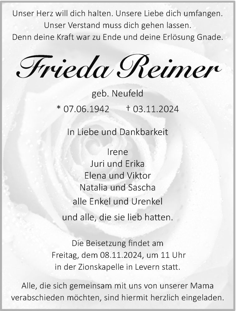 Hier finden Sie alle Traueranzeigen aus der Zeitung, die bisher für Frieda Reimer erschienen sind. Weitere Traueranzeigen, die in der Zeitung erscheinen, werden hier ebenfalls aufgelistet
