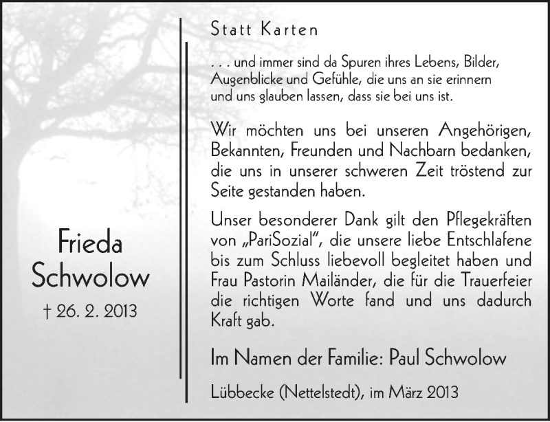 Hier finden Sie alle Traueranzeigen aus der Zeitung, die bisher für Frieda Schwolow erschienen sind. Weitere Traueranzeigen, die in der Zeitung erscheinen, werden hier ebenfalls aufgelistet