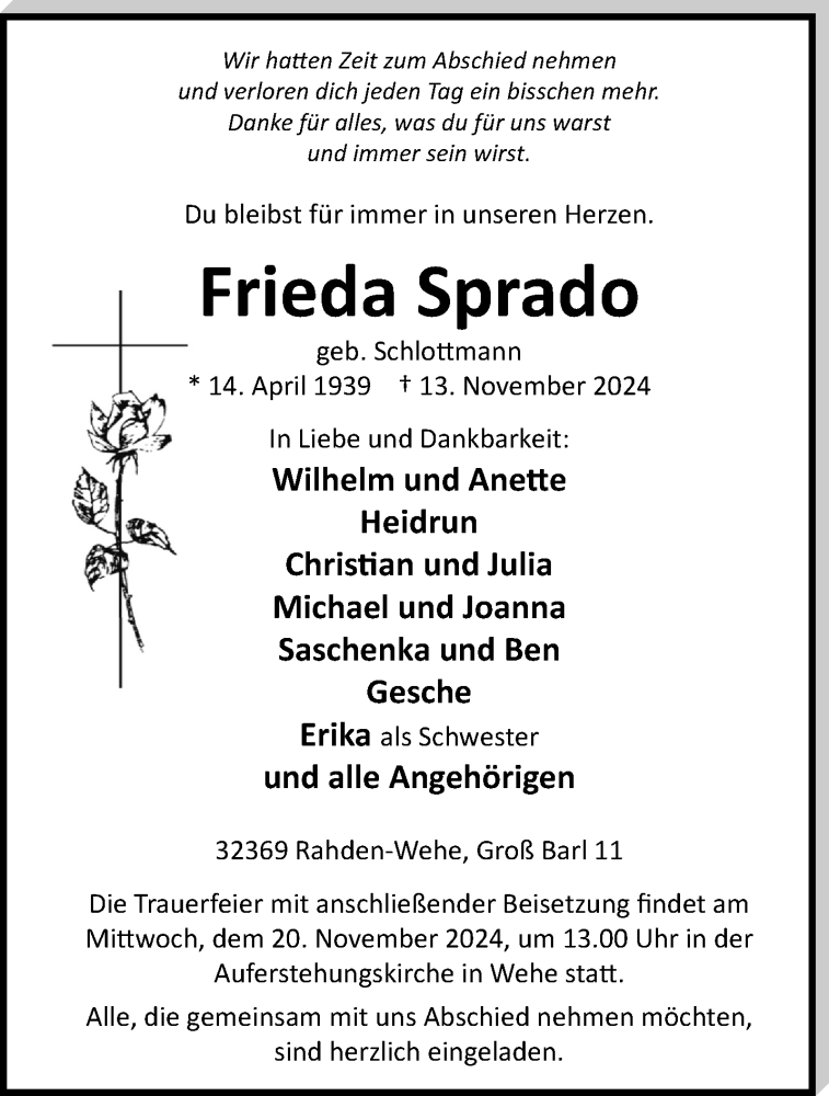 Hier finden Sie alle Traueranzeigen aus der Zeitung, die bisher für Frieda Sprado erschienen sind. Weitere Traueranzeigen, die in der Zeitung erscheinen, werden hier ebenfalls aufgelistet