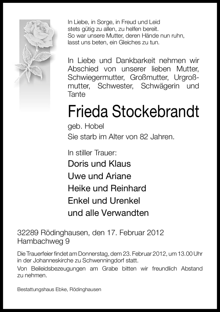 Hier finden Sie alle Traueranzeigen aus der Zeitung, die bisher für Frieda Stockebrandt erschienen sind. Weitere Traueranzeigen, die in der Zeitung erscheinen, werden hier ebenfalls aufgelistet