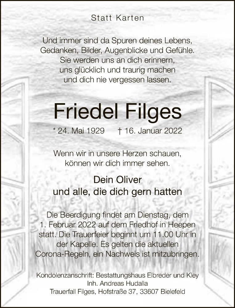 Hier finden Sie alle Traueranzeigen aus der Zeitung, die bisher für Friedel Filges erschienen sind. Weitere Traueranzeigen, die in der Zeitung erscheinen, werden hier ebenfalls aufgelistet