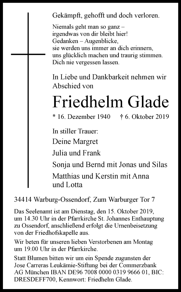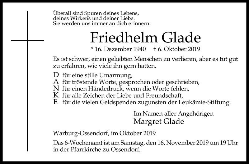 Hier finden Sie alle Traueranzeigen aus der Zeitung, die bisher für Friedhelm Glade erschienen sind. Weitere Traueranzeigen, die in der Zeitung erscheinen, werden hier ebenfalls aufgelistet