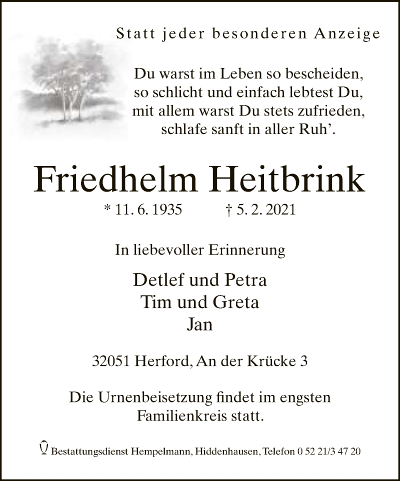 Hier finden Sie alle Traueranzeigen aus der Zeitung, die bisher für Friedhelm Heitbrink erschienen sind. Weitere Traueranzeigen, die in der Zeitung erscheinen, werden hier ebenfalls aufgelistet