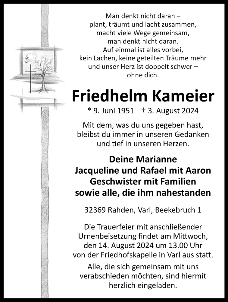 Hier finden Sie alle Traueranzeigen aus der Zeitung, die bisher für Friedhelm Kameier erschienen sind. Weitere Traueranzeigen, die in der Zeitung erscheinen, werden hier ebenfalls aufgelistet