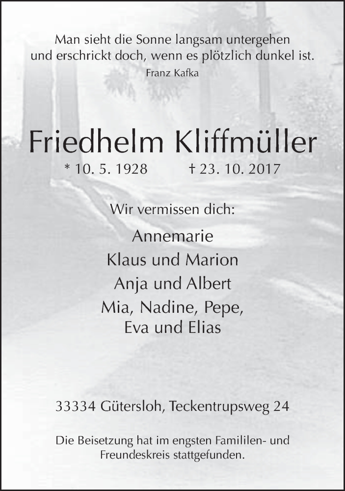 Hier finden Sie alle Traueranzeigen aus der Zeitung, die bisher für Friedhelm Kliffmüller erschienen sind. Weitere Traueranzeigen, die in der Zeitung erscheinen, werden hier ebenfalls aufgelistet